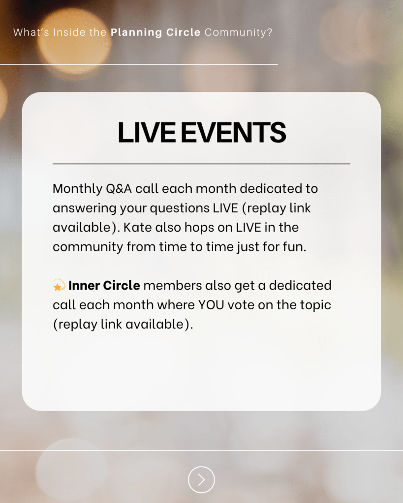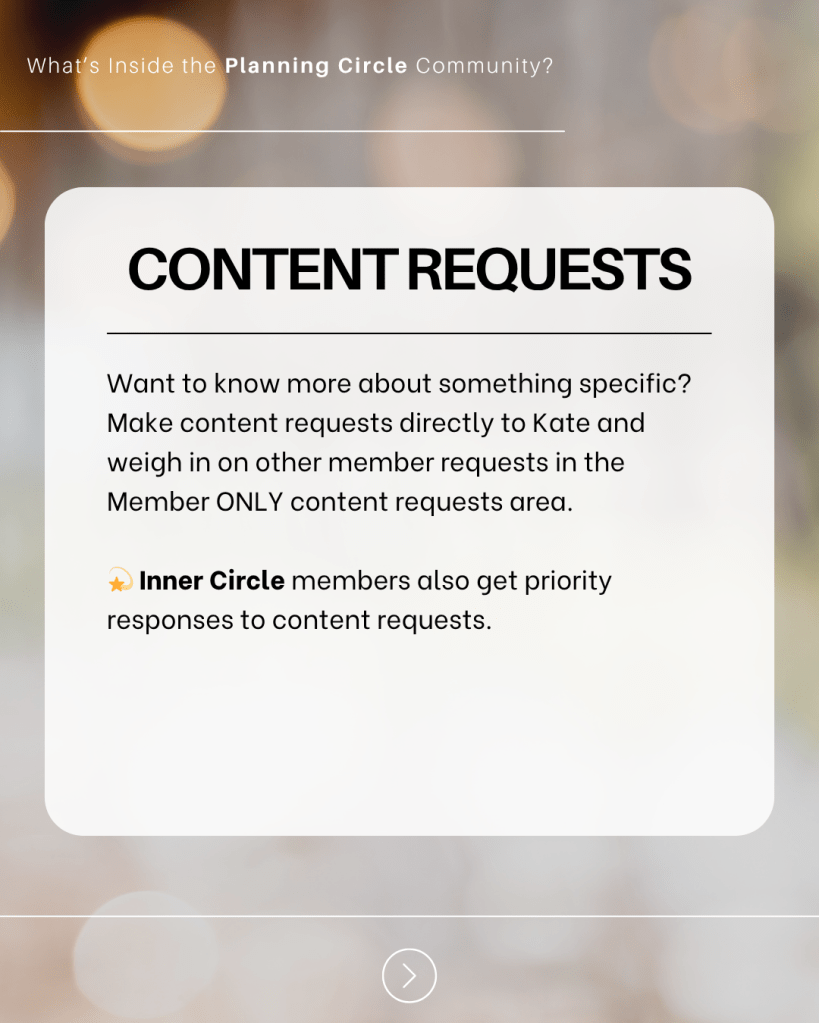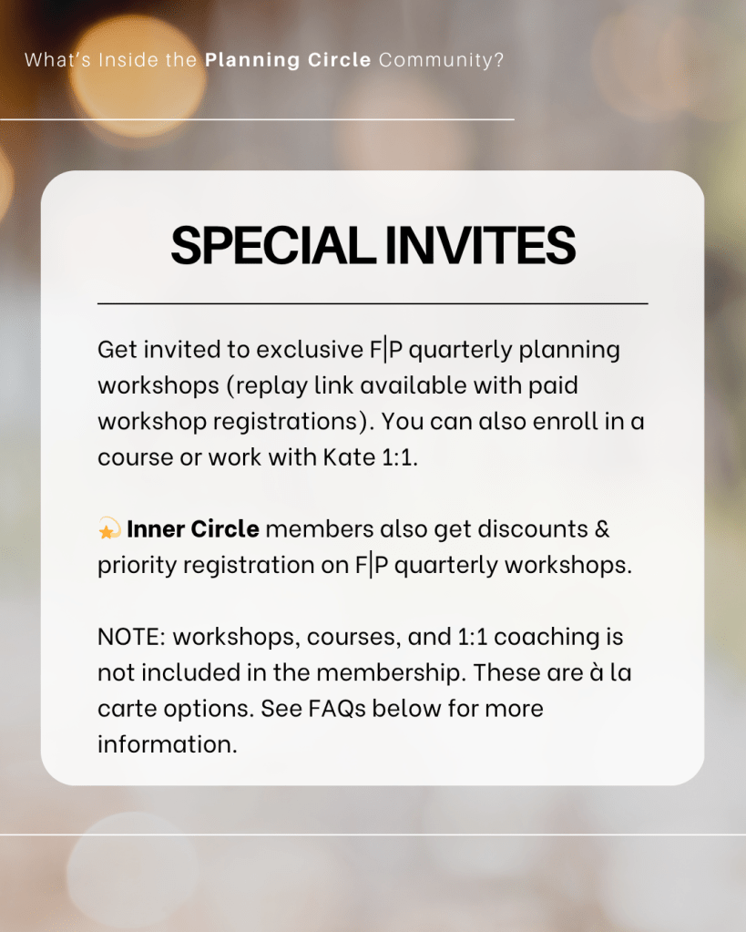 Let’s be honest – public content is polished and fully edited. Inside the F|P Planning Circle community, you’ll see content that’s in progress, unedited, live, and things that might not ever make it to a public space. You’ll get a behind the scenes look at what Kate’s working on and see her thought process in action. You’ll also be able to share and connect with others in the community as we explore the function that planning serves in our lives.